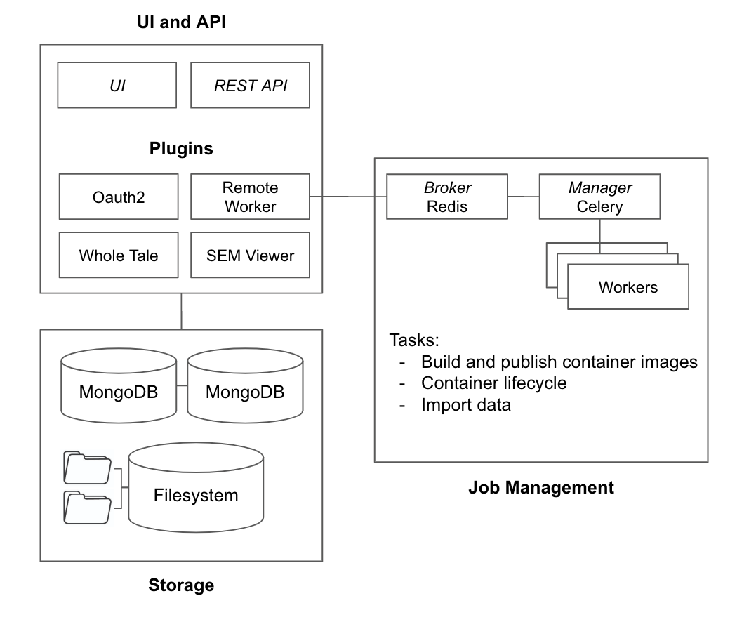 Girder is an open-source, scalable and extensible platform for data management. It provides core capabilities for data organization (files, items, folders, and collections); user management and authentication; access control and authorization. Girder’s plugin architecture simplifies the process of implementing custom user interface components, REST APIs, and backend capabilities. For example, the Girder Worker plugin used by Whole Tale enables distributed task execution based on Celery.