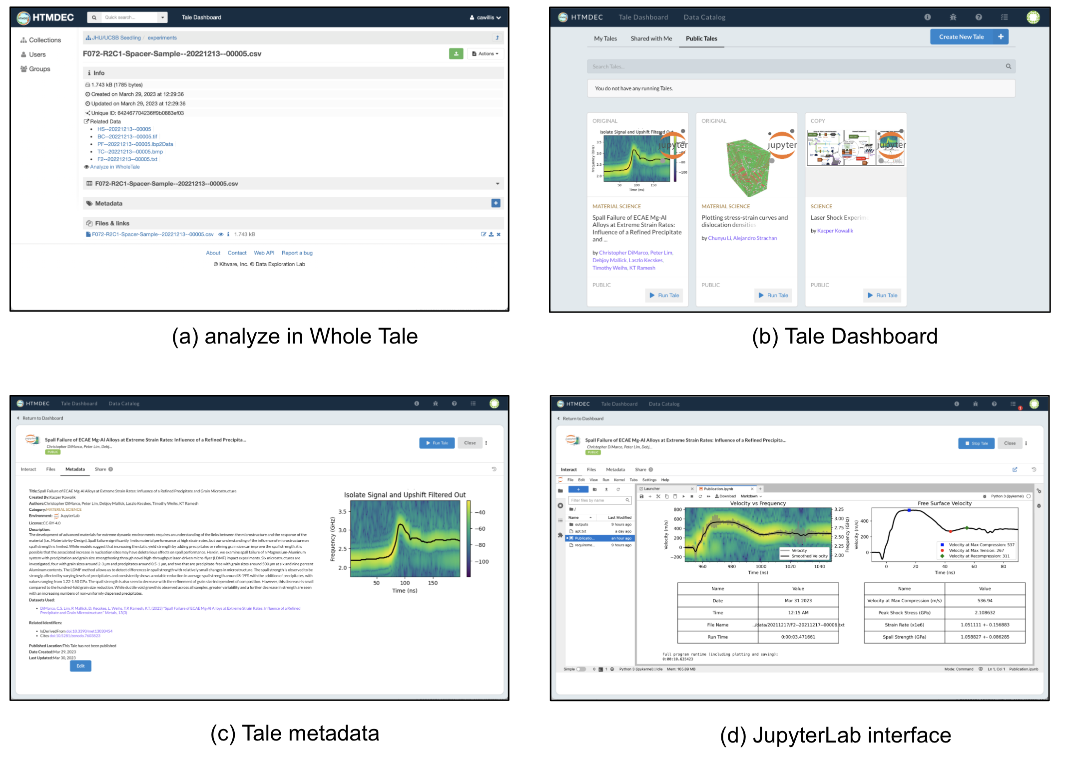 The HTMDEC data portal user interface is illustrated in Fig. 9 illustrates the Whole Tale capabilities provided to HTMDEC seedling collaborators. From within the HTMDEC data portal, users can select data to be analyzed in Whole Tale (a) and browse or share existing tales with other users (b). Tales (c) are customizable container images based on comment IDEs such as JupyterLab (d).