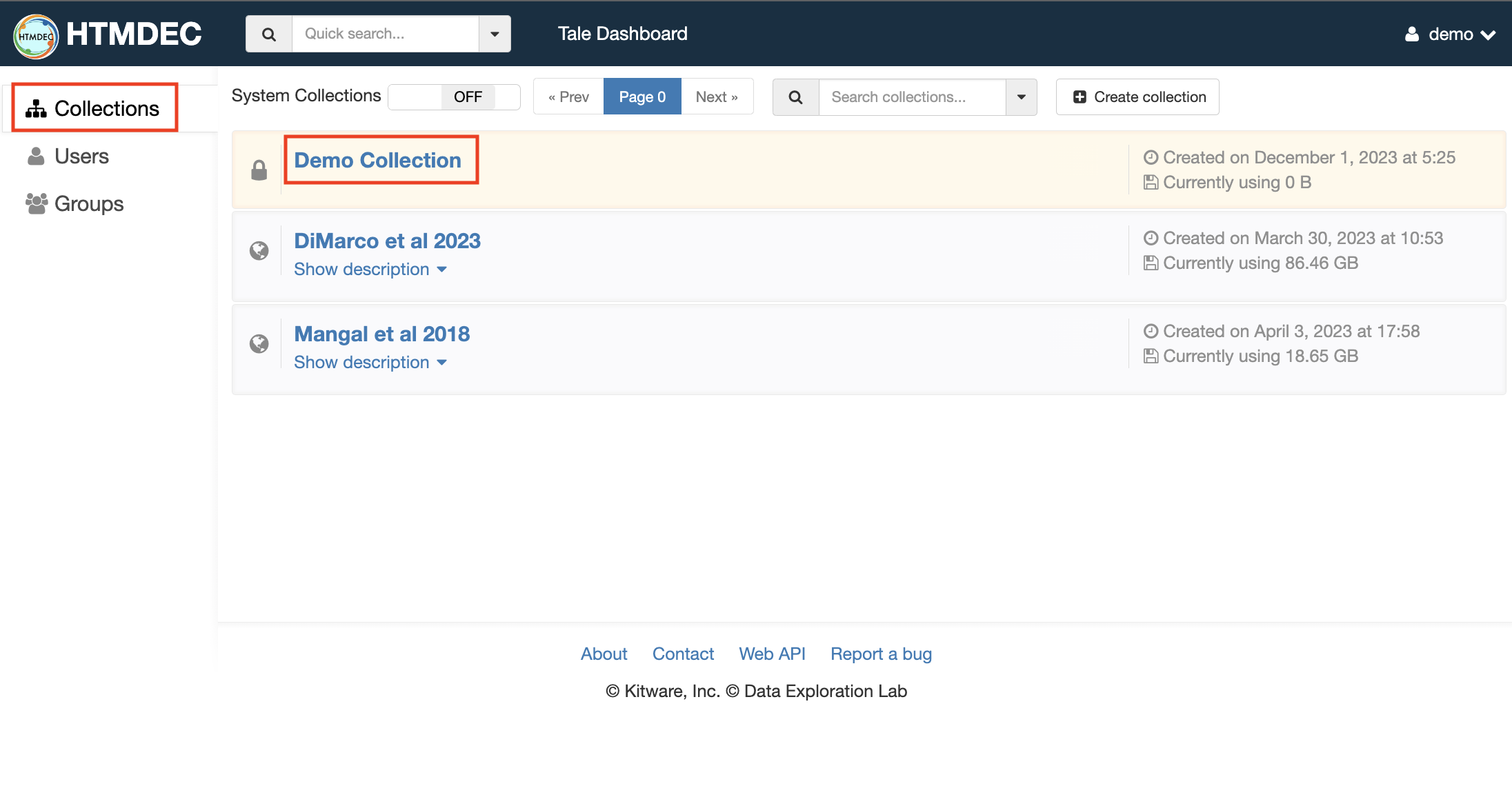 Data in the HTMDEC DMS is organized into per-seedling collections. Collections are access controlled, so team members must be granted access to manage data in each collection.