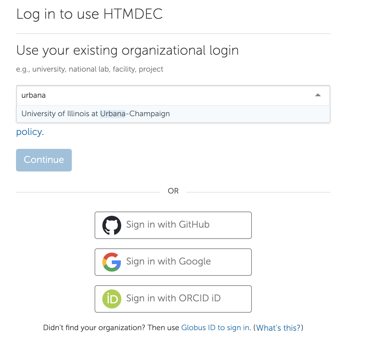 Search for your institution and select the “Continue” button or login using your GitHub, Google, or ORCID credentials: