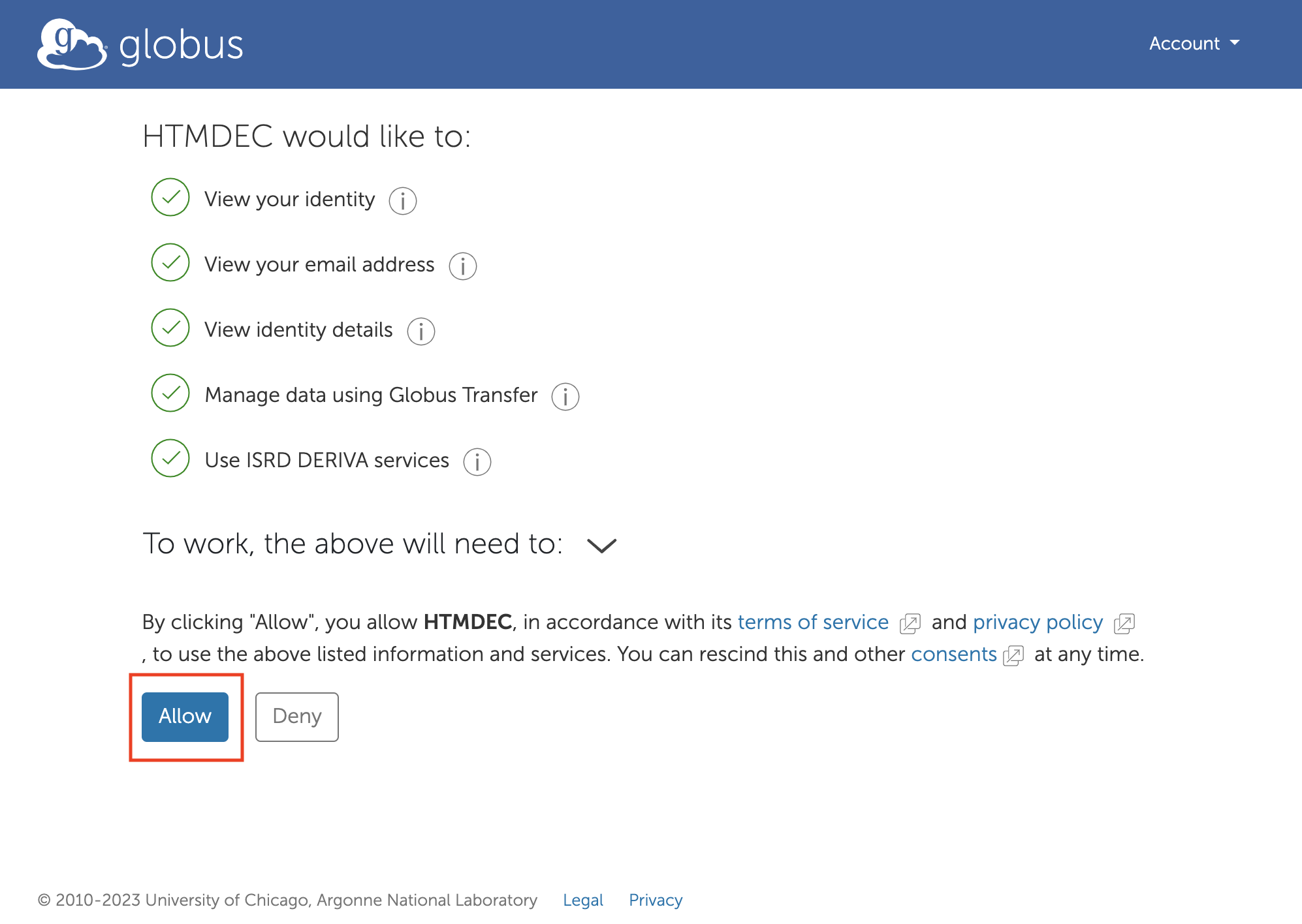 The first time you login, you will be prompted to authorize Globus to access information about you. Select “Allow”: