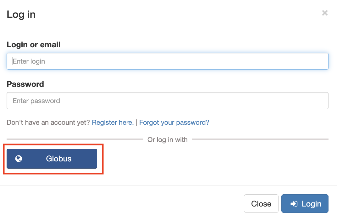 Select the “Globus” button. HTMDEC uses Globus Authentication to support single sign-on using your institutional credentials.