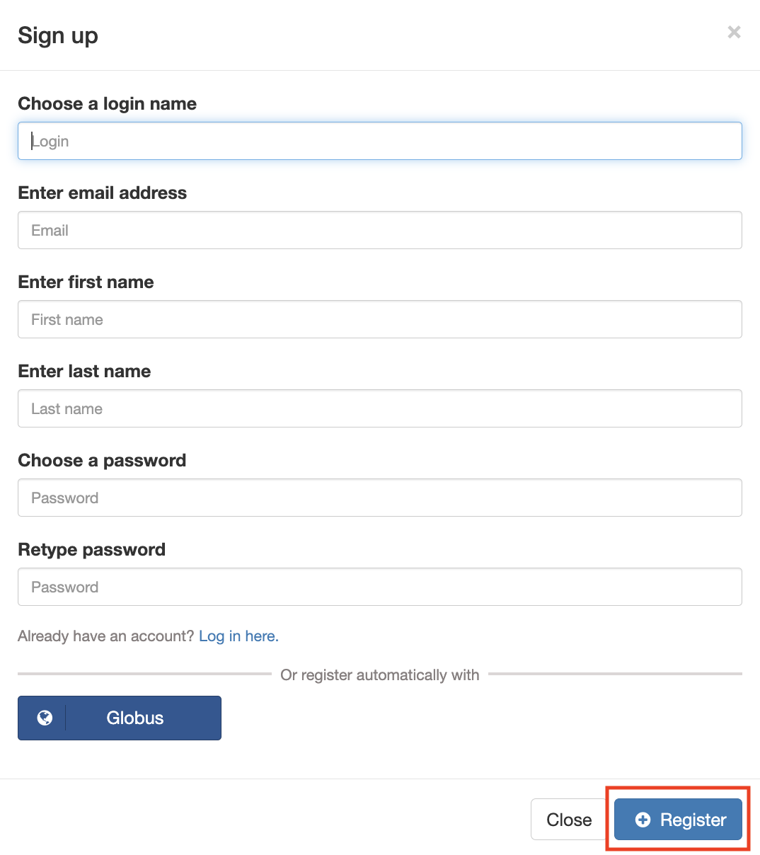 Fill in the registration form and select the “Register” button: